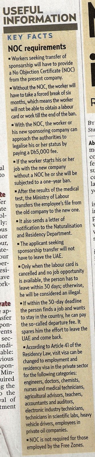 4) Private to private sector: If the transfer is between private sector companies, the following conditions apply: Approval of the previous sponsor, the new sponsor and the Ministry of Labour, if the job is among the categories subject to Labour Law. The sponsored person must hold a valid residency visa and must have spent at least a year working in his job.