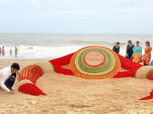Happy Raksha Bandhan… Artist Sudarsan Pattnaik makes a sculpture of Rakhi, with a message against terrorism inscribed on it, at Puri beach in Orissa on Monday.