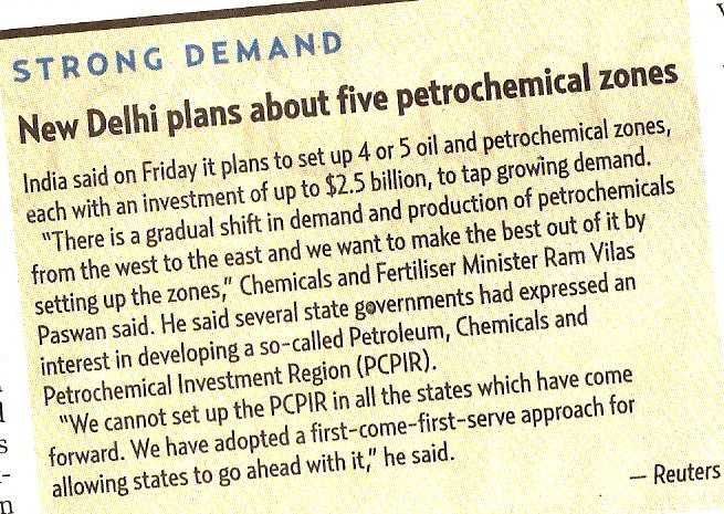 “There is a gradual shift in demand and production of petrochemicals from the west to the east and we want to make the best out of it by setting up the zones,” Chemicals and Fertiliser Minister Ram Vilas Paswan said. He said several state governments had expressed an interest in developing a so-called Petroleum, Chemicals and Petrochemical Investment Region (PCPIR).
