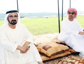Shaikh Mohammad with Shaikh Hamdan Bin Zayed Al Nahyan, Deputy Prime Minister, during the final special Cabinet session in the garden of President His Highness Shaikh Khalifa Bin Zayed Al Nahyan’s palace in Liwa.