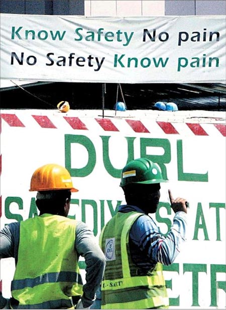 ‘Safety at work’ is being stressed currently by the Dubai Municipality and its allied departments. A slogan put up at a Dubai Metro construction site on Khalid Ibn Waleed Road highlights the theme of the campaign. – ‘Know safety, No Pain and No Safety, Know Pain. – Photo by Mukesh Kamal KHALEEJ TIMES