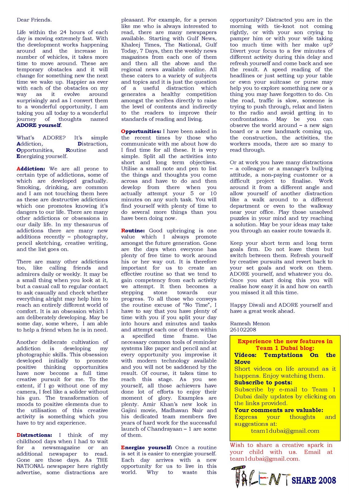 Distractions: I think of my childhood days when I had to wait for a newsmagazine or an additional newspaper to read. Gone are those days. As THE NATIONAL newspaper here rightly advertise, some distractions are pleasant. For example, for a person like me who is always interested to read, there are many newspapers available. Starting with Gulf News, Khaleej Times, The National, Gulf Today, 7 Days, then the weekly news magazines from each one of them and then all the above and the regional news available online. All these caters to a variety of subjects and topics and it is just the question of a useful distraction which generates a healthy competition amongst the scribes directly to raise the level of contents and indirectly to the readers to improve their standards of reading and living.