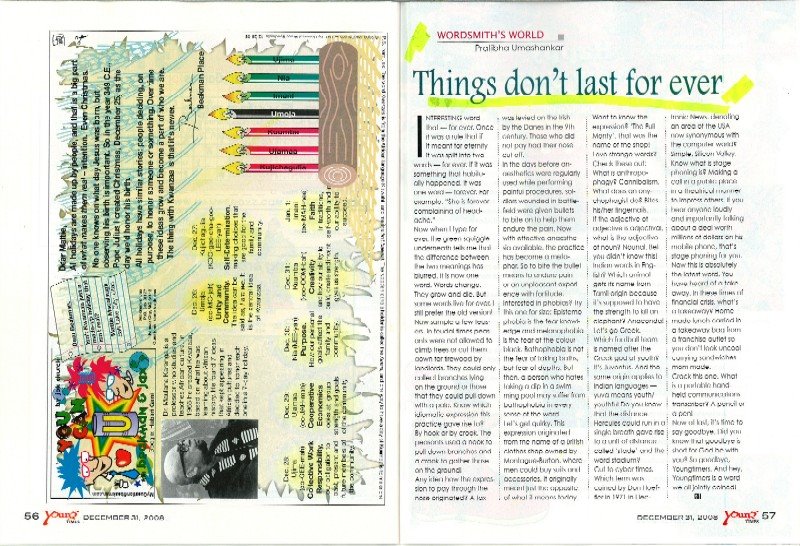 I was lucky to read each and every issue that was published except the first two years of it’s entry into this media world. The habit of following the prints closely made me more attached to it and Young Times became an integral part of my family. Even the Bangladeshi newsboy Mamtaz who deiver it at home became our family friend. As many of you including myself grew older with it, and the horizon of our bits and pieces of knowledge expanded with it, I just would like to express my thanks to all the team members who worked for it with my sincere heart and prayers. They were doing a great job for the children around. To compete with the visual world and stay alive is a big task and even during the final walks of their journey they remained totally committed for the cause of Young. The final edition carried all those features that used to be there all these weeks and were more interesting than the previous ones.