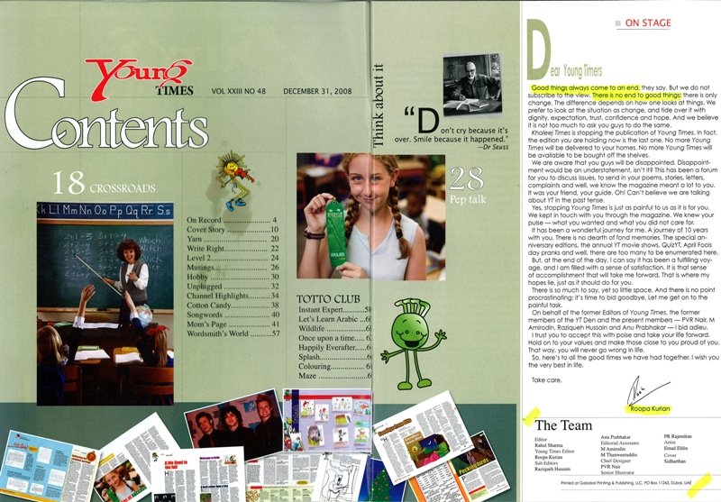 When I thought about this idea, I never thought I will be doing the first of this series about an item on a tragic incident that happened to the world of creative children in and around UAE. The popular magazine Young Times have come to an end on 31st December 2008. As the saying goes there is destiny and fate and definite ending to all finite and infinite objects in this world, what a fitting departure date for this wonderful magazine for the young (and old).