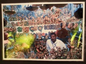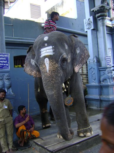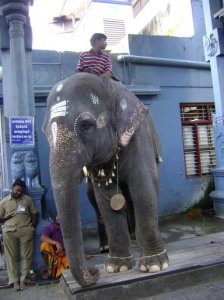 A decorated temple elephant waiting for devotees to shower his blessings and in turn their offerings for his and his mahouts daily bread.