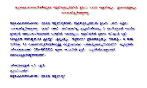 Yuvakalasahithy Sharjah Unit Conducting Mridaga Patana Kalari and Mridangamela by