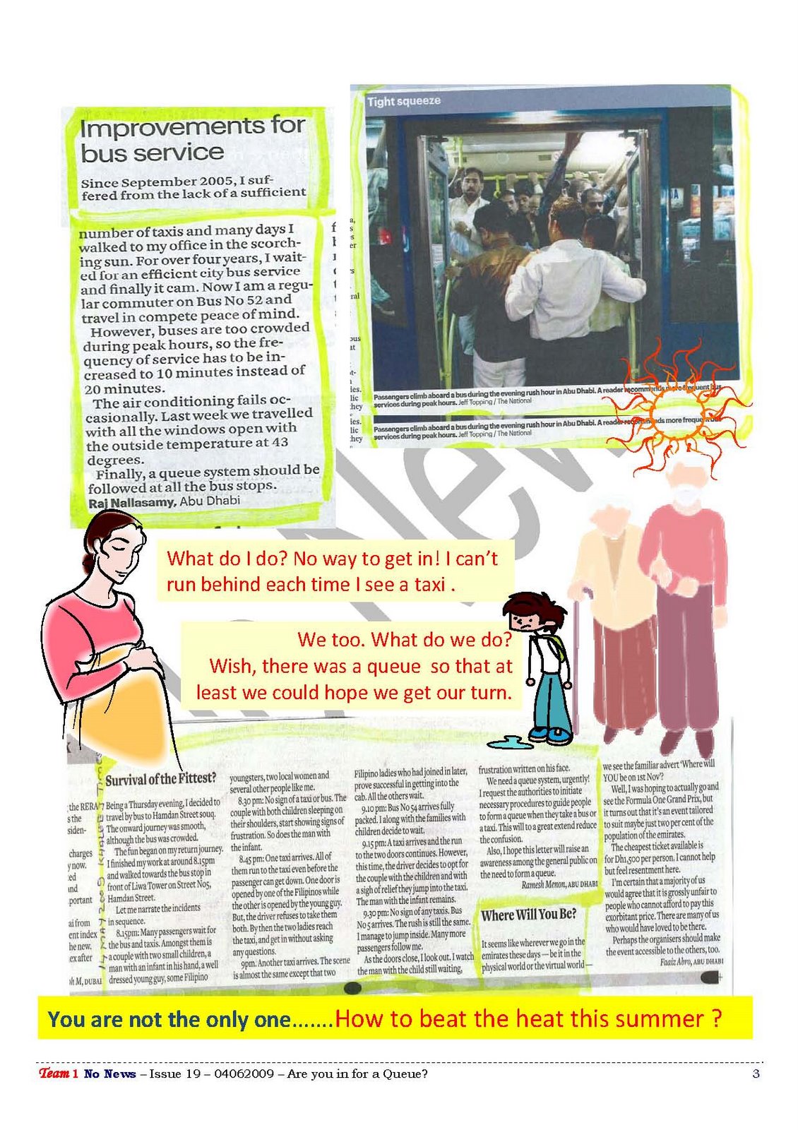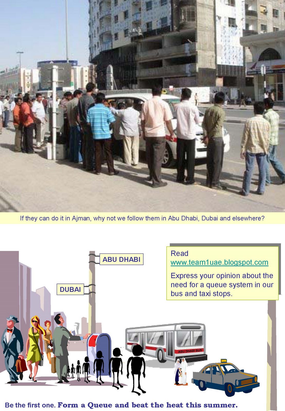 We need a Queue culture on our bus and taxi stops. It holds significant value and should be gradually put in to practise before the most advanced transport systems are made available in this country. In Dubai, the Metro is coming, in Abu Dhabi the new Abu Dhabi Bus and Taxis. What will be the benefit of all these advancements if no queue system is followed on our rail and road?