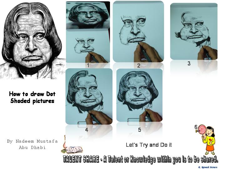 Following the shades in the picture, the dots can be put, carefully leading from one point to another. Then start the lips. By the time you finish the lips, you will get an idea of the person whom you are trying to complete. If it is not coming out right at this point of time, you may have to start all over again.