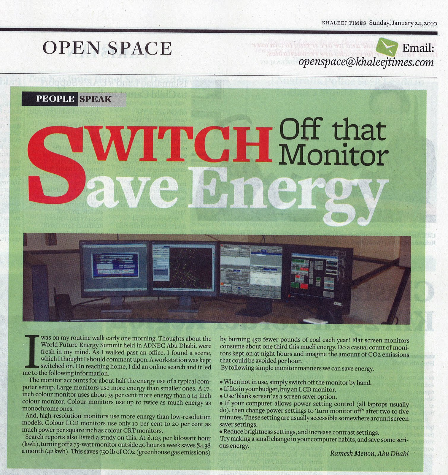 My Letters – Khaleej Times – Dt 24 Jan 2010 – Switch off that monitor Save Energy
