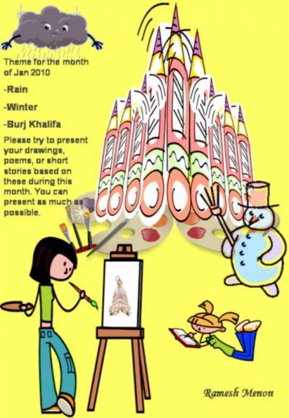 9. Please note that the theme for this month is “Rain, winter and Burj Khalifa”. Plans are in place to present a complete collection of the presented work to respectable groups/authorities to honor the creativity. So, please make sure your work (painting, drawing, poems, short stories etc…) are there in this exclusive presentation.