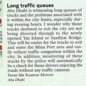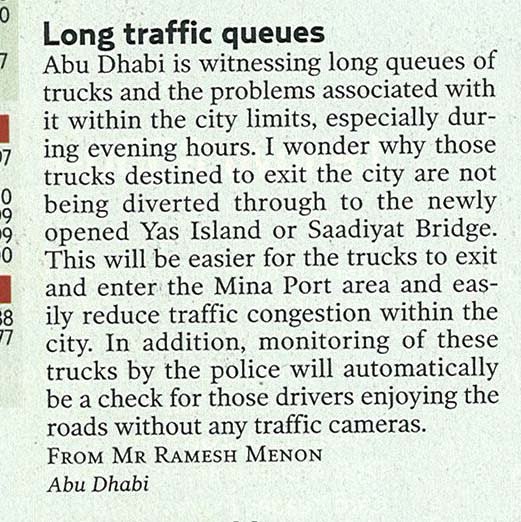 My Letters – GULF NEWS – Dt 19 Jan 2010 – Long Traffic Queues