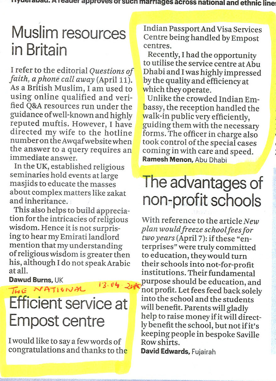Efficient service at Empost centre – My Letters – THE NATIONAL – Dt. 13.04.2010