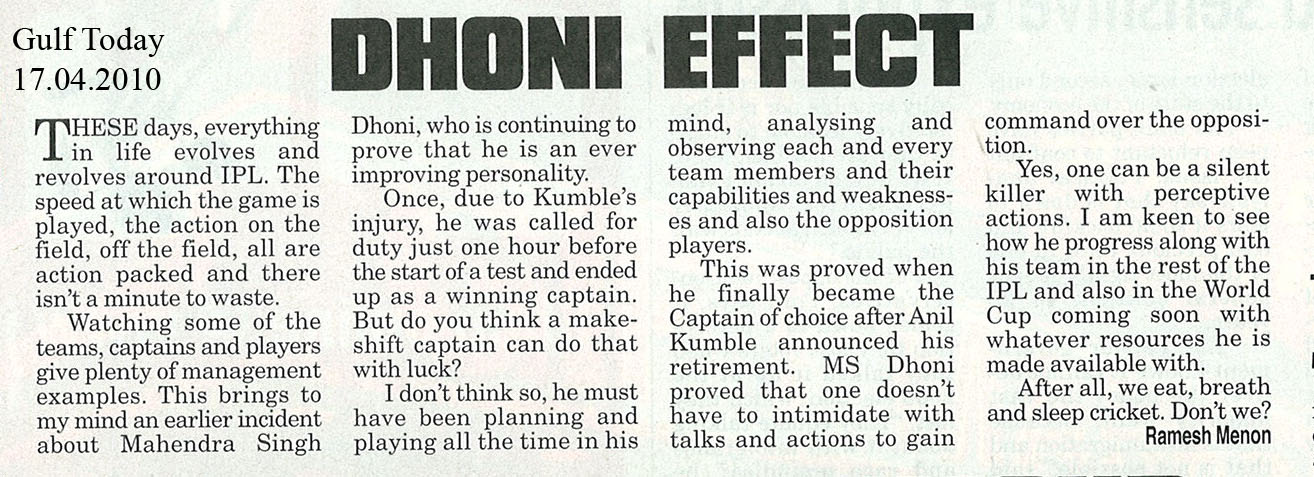 My Letters – Gulf Today – Dt. 17.04.2010 – Dhoni Effect