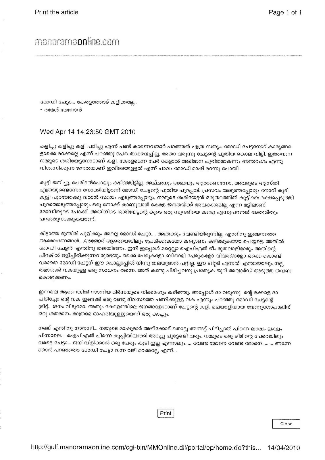 My Creatives – Malayala Manorama Online Dt. 14.04.2010 – Modi Chetta Keralathodu Kalikkalle