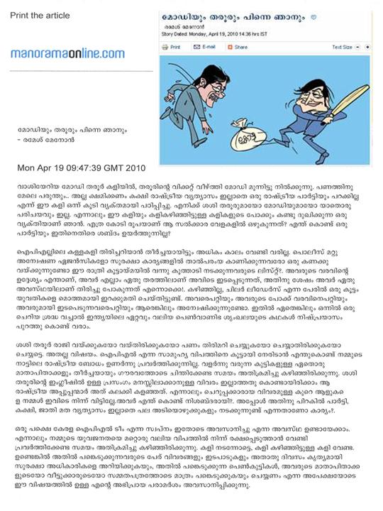 My Opinon – Malayala Manorama – Dt. 19.04.2010 – Modiyum Tharoorum pinne Njaanum