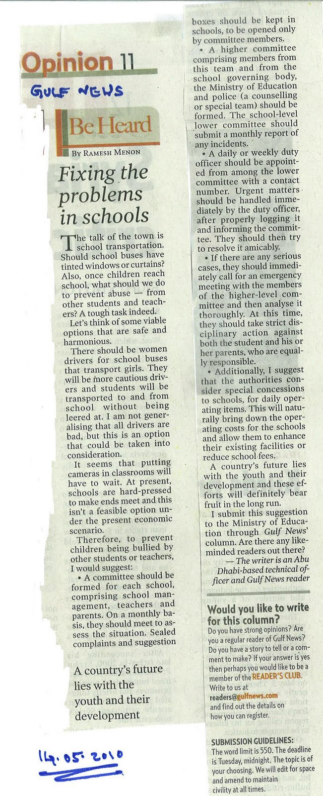 Speak your mind – GULF NEWS – Be Heard – Dt. 14.05.2010 – Fixing the problems in schools