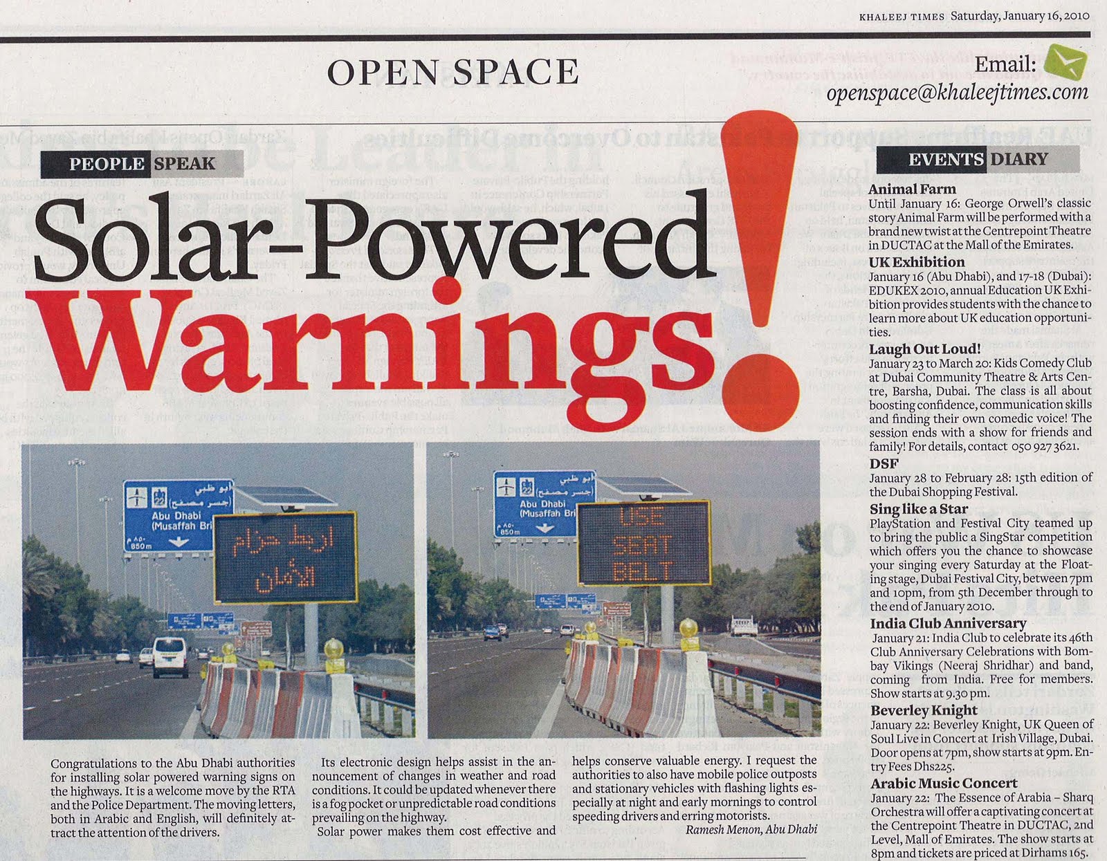 My Letters – Khaleej Times – Dt 16 Jan 2010 – Solar powered warnings