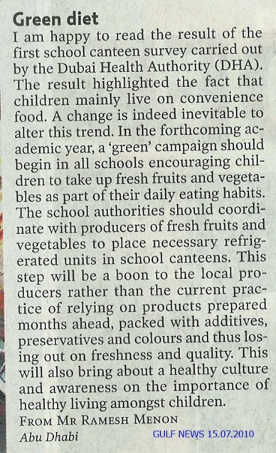 My Letters – GULF NEWS Dt. 15.07.2010 – Green Diet