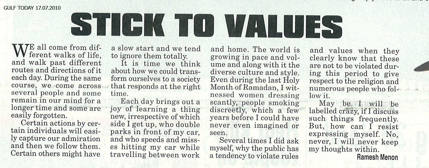 Short Take – GULF TODAY – Dt. 17.07.2010 – Stick to values
