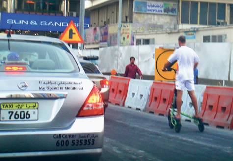 They are in uniform and remain on the pavements. However, I have been witnessing common folk using the same type of vehicles on the road, through the busy city streets of Abu Dhabi.