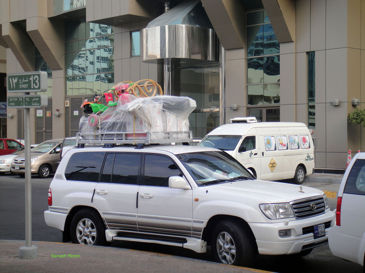A 4×4 all set for a holiday travel. Many expat from neighbouring gulf countries travel by road to their home countries. Although traffic department regularly issue warnings to excessive luggage on top, they all carry much more than what they can.