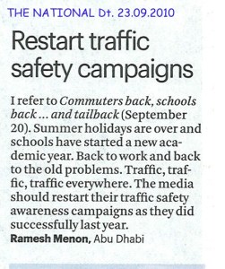 Restart traffic safety campaigns – My Letters – THE NATIONAL – Dt. 23.09.2010