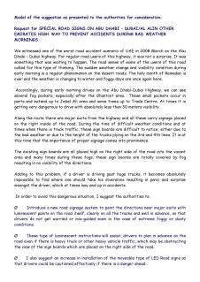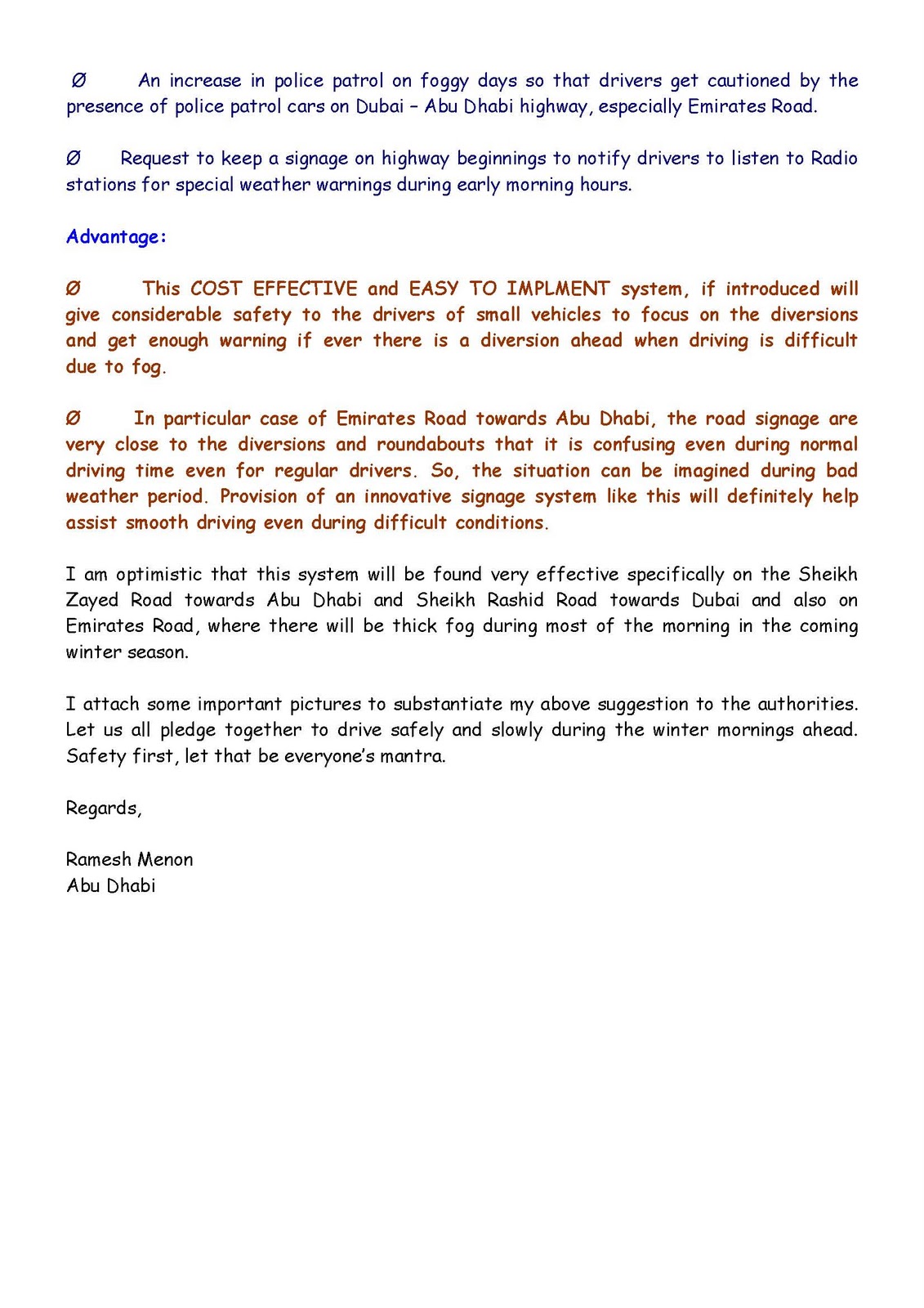 – Introduce a new road signage system. Signboards near major exits can have luminescent paint, along with clear markings on roads. These should be present well in advance, so that drivers do not get worried and are not misguided, even in case of extreme foggy or dusty conditions.