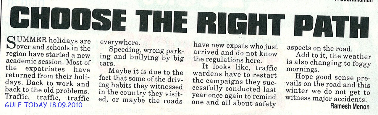 Short Take – GULF TODAY – Dt. 18.09.2010 – Choose the right path