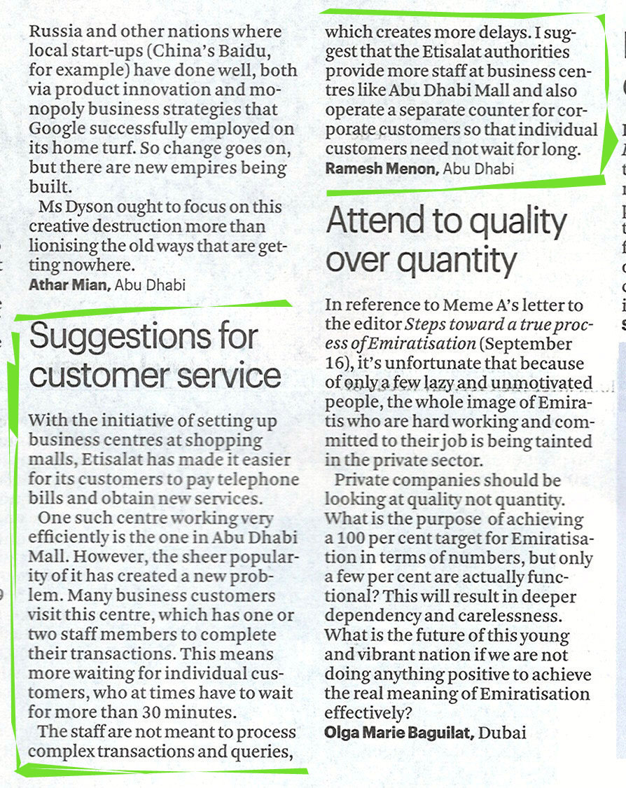 Suggestion for customer service – My Letters – THE NATIONAL – Dt. 20.09.2010