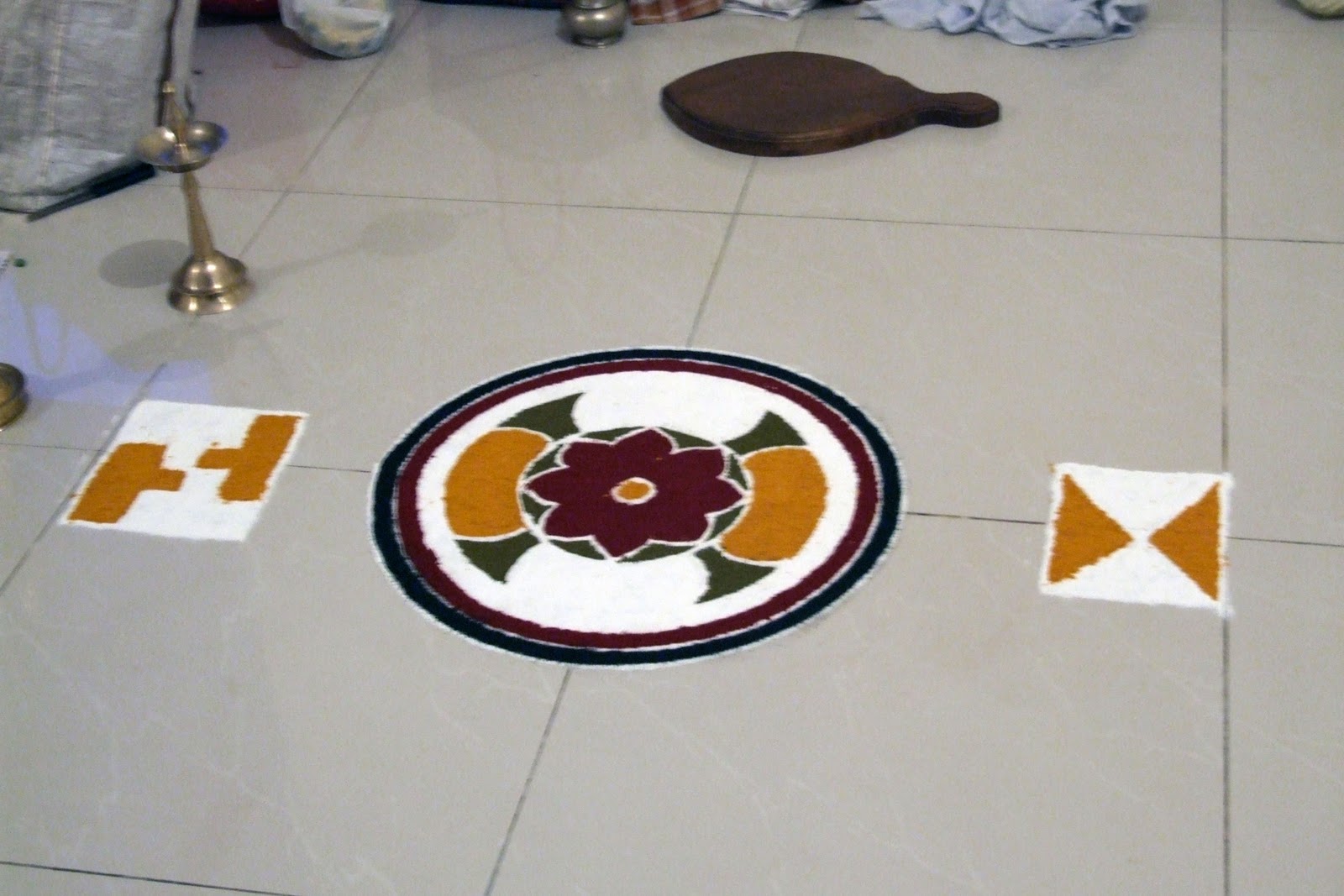 A simple but beautiful kalam (or religious platform) prepared using rice powder, turmeric, kumkum, and powdered leaves. This is normally done before keralites hindu priests when they do pooja at home, where idols are not used. They prepare this platform and do sankalpam (meditate upon) the god or godess and perform the pooja.
