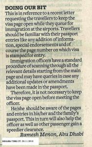 This is in reference to a recent letter requesting the travellers to keep the visa page open while they queue for immigration at the airports. Travellers should be familiar with their passport entries like any addition of information, special endorsements and of course the page number on which visa is stamped for entry.