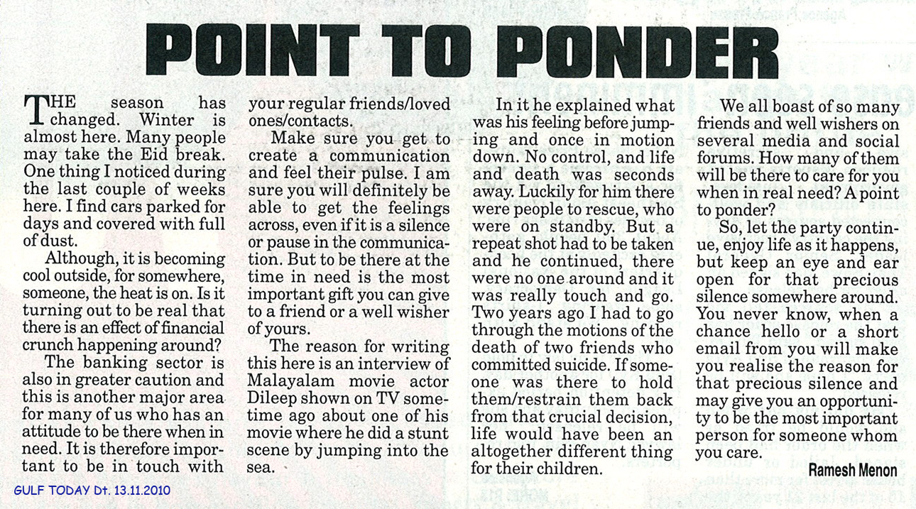So, let the party continue, enjoy life as it happens, but keep an eye and ear open for that precious silence somewhere around. You never know, when a chance hello or a short email from you will make you realise the reason for that precious silence and may give you an opportunity to be the most important person for someone whom you care.