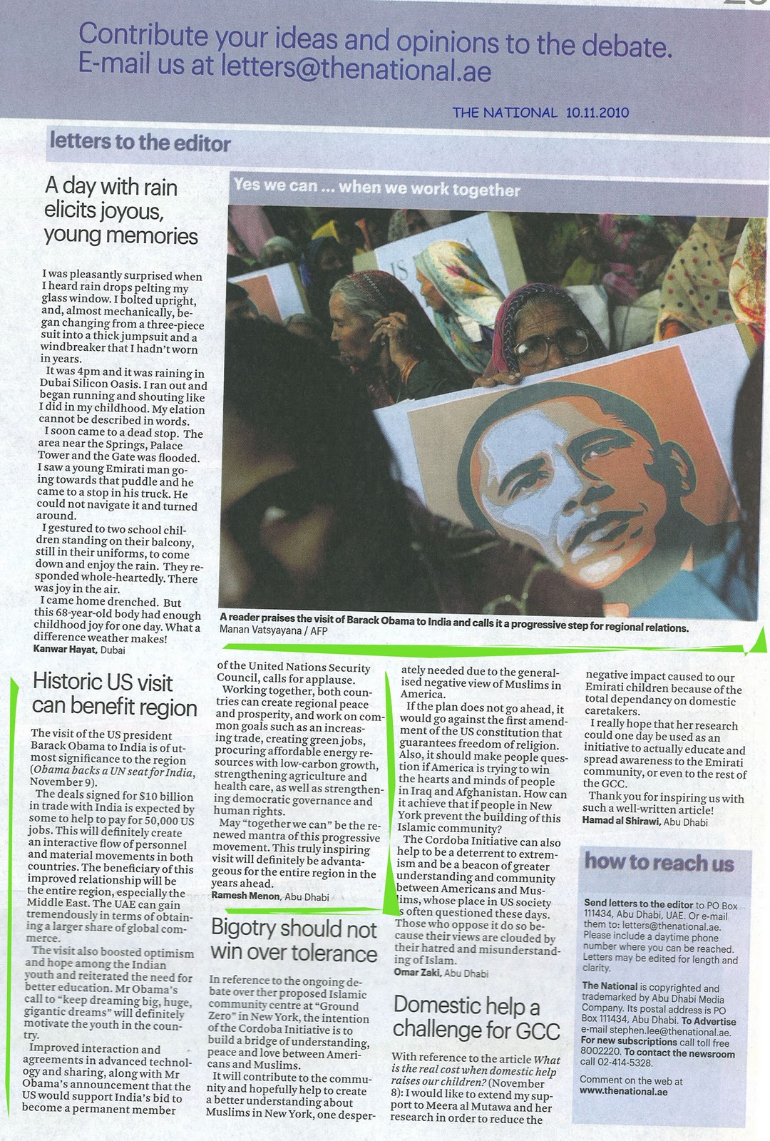 My Letters – THE NATIONAL – Dt. 10.11.2010 – Historic US visit can benefit region