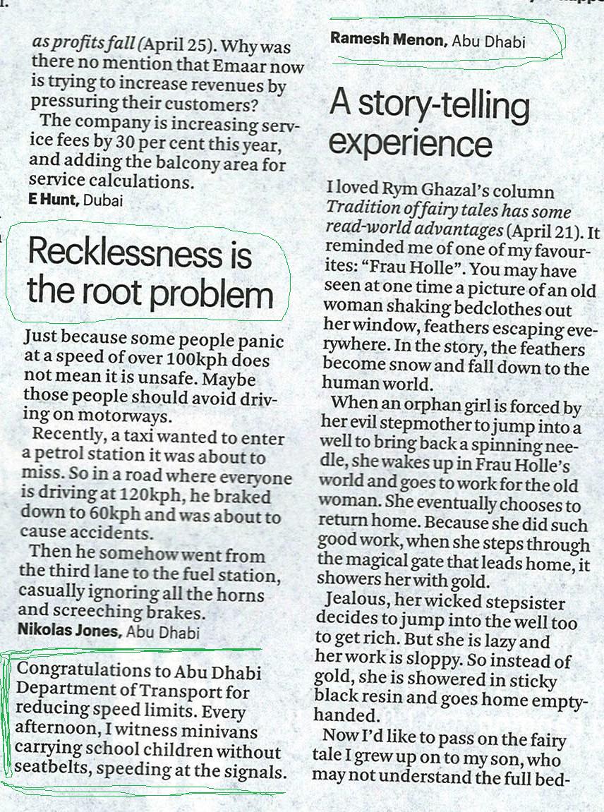 Congratulations to Abu Dhabi Department of Transport for reducing speed limits. Every afternoon, I witness minivans carrying school children without seatbelts, speeding at the signals.