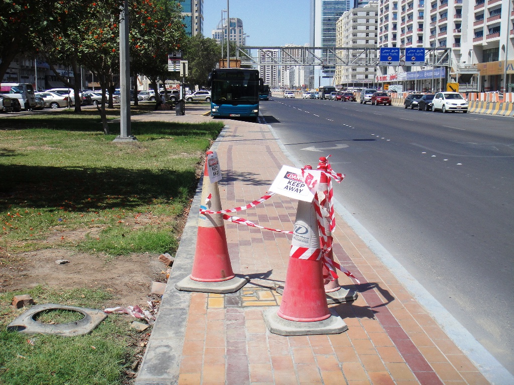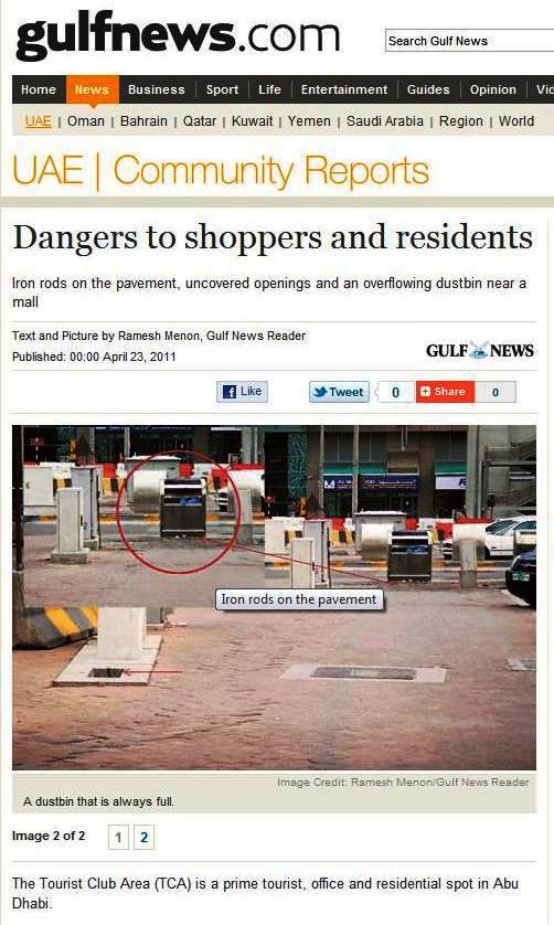 It is always a relief to see when the authorities carries pro-active measures towards suggestion for a better living environment. Here is one such example of a speedier action by Abu Dhabi authorities. Further to my Community Report in Gulf News dated 23rd April, I am happy to blog that both the dangerous spots have been marked clearly giving sufficient warning for pedestrians. What is left is a garbage bin issue, and I believe it will be also handled efficiently soon.