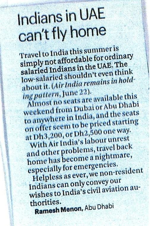 Travel to India this summer is simply not affordable for ordinary salaried Indians in the UAE. The low-salaried shouldn’t even think about it. (Air India remains in holding pattern, June 22).