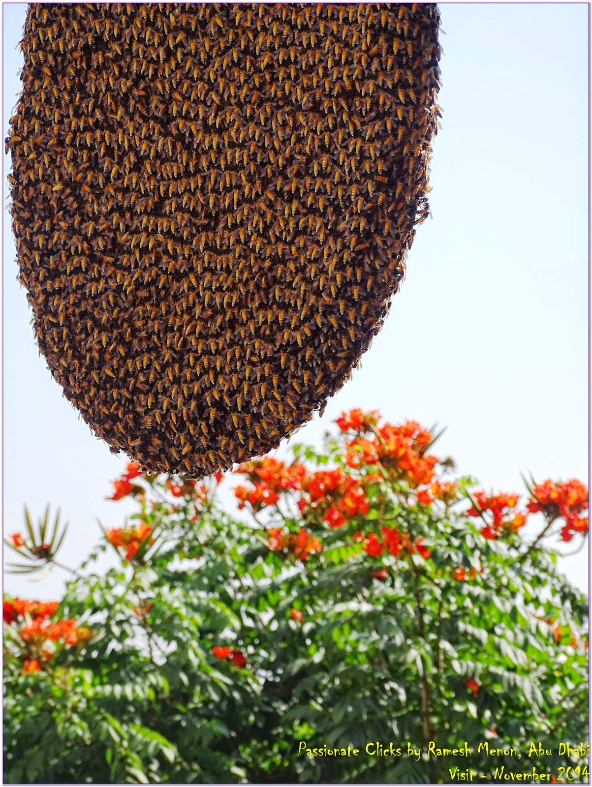 Wherever flowers blossom, you are sure to see honey bees. Our apartment complex is not an exception. No wonder, it has the right name and rightly the consecutive winner for one of the best garden in the city. A bee hive getting bigger, better and beautiful each day in front of the balcony of my apartment at Bangalore. Hope, no one disturbs their community and their life. So far so good. It will be a disaster if they are disturbed or hurt. It is true communal harmony is very important for peaceful living.