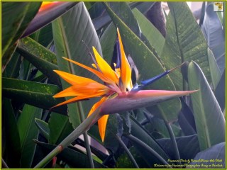 The plant grows to 2 m (6.6 ft) tall, with large, strong leaves 25–70 cm (9.8–27.6 in) long and 10–30 cm (3.9–11.8 in) broad, produced on petioles up to 1 m (39 in) long. The leaves are evergreen and arranged in two ranks, making a fan-shaped crown. The flowers stand above the foliage at the tips of long stalks. The hard, beak-like sheath from which the flower emerges is termed the spathe. This is placed perpendicular to the stem, which gives it the appearance of a bird’s head and beak; it makes a durable perch for holding the sunbirds which pollinate the flowers. The flowers, which emerge one at a time from the spathe, consist of three brilliant orange sepals and three purplish-bluepetals. Two of the blue petals are joined together to form an arrow-like nectary. When the sunbirds sit to drink the nectar, the petals open to cover their feet in pollen.
