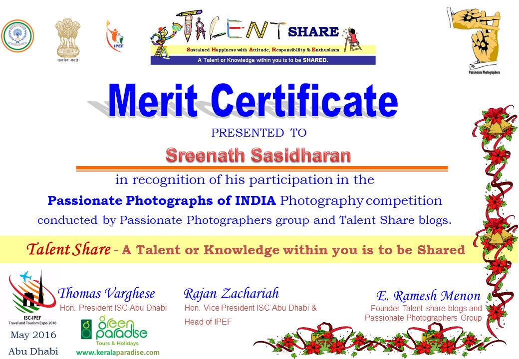 Certificate for participants Passionate Photographs of India 2016 for printing – Sreenath Sasidharan