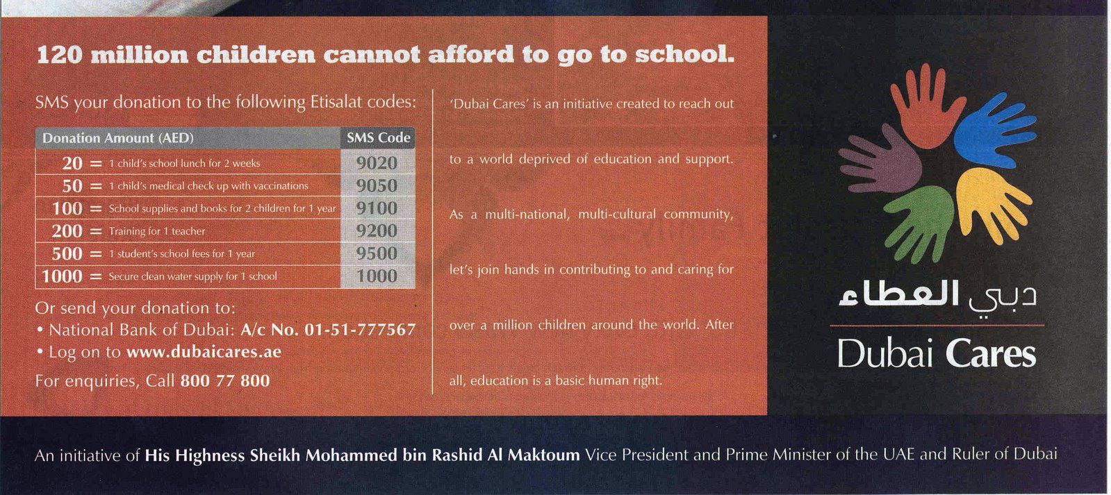 “Dubai Cares” is a charitable campaign, lead by H.H. Sheikh Mohammed Bin Rashid Al Maktoum that serves to focus the multicultural community of Dubai on raising money to support a global cause.