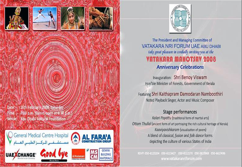 You are cordially invited to grace the occasion of VATAKARA MAHOTSAV 2008 and enjoy the evening on 16th February 2008 Saturday, from 6:30 pm at the Abu Dhabi Cultural Foundation.