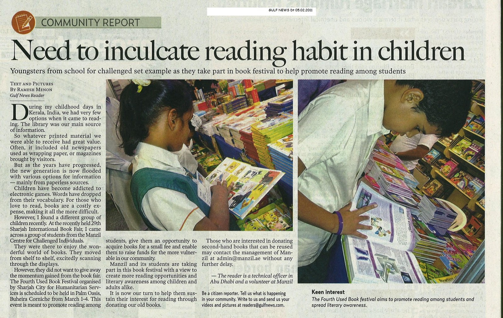 Need to inculcate reading habit in children – Community Report – GULF NEWS – Dt. 05.02.2011
