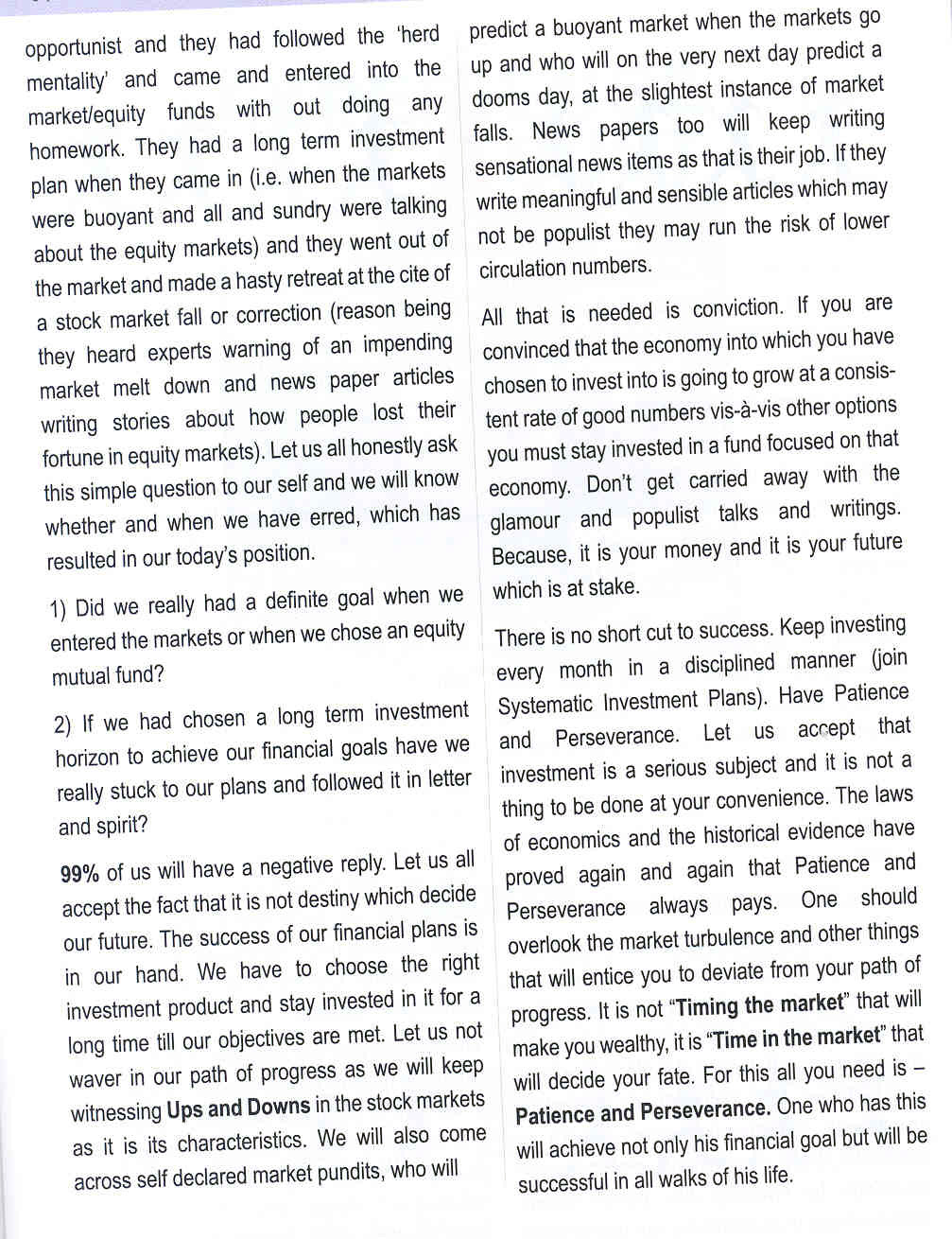 Invest regularly. The power of compounding and systematic investment plans goes a long way in wealth accumulation. Finally, bear in mind that there are no permanent bull and bear markets. Disciplined investing and avoiding speculation will help investors.