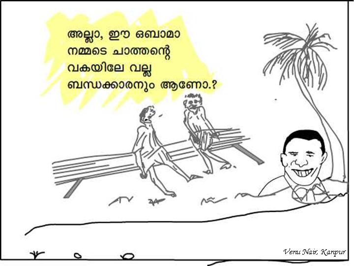 ജാതി ചോദിക്കുന്നവര് ആരാണു്.ഒബാമായുടെ ജാതി എന്തെന്ന് പോസ്റ്റു മാര്ട്ടം നടക്കുകയാണു്. കറുമ്പനോ വെളുമ്പനോ.?മുസ്ലീമോ സത്യ ക്രിസ്ത്യാനിയോ.?അല്ലല്ലിതെന്തു കഥയിതു കഷ്ടമേഅല്ലലാലങ്ങ് ജാതി മറന്നിതോ.?ആരാ മറക്കുന്നത്. മറന്നത് ചവറ്റു കുട്ടയില് നിന്ന് അരിച്ച് പെറുക്കി പത്രങ്ങളില് നിറഞ്ഞു കൊണ്ടിരിക്കുന്നു. ഒബാമയുടെ ജാതി കണ്ടു പിടിച്ച് സ്വന്തം ജാതിയില് പ്രതിഷ്ടിക്കാന് വന് മത്സരം നടക്കുന്നു.ഏതോ സിനിമയില് കണ്ടതാണു്.കൊച്ചു മകന്റെ കൂട്ടുകാരന് വീട്ടിലെത്തി.ചാവടിയില് ചാരുകസേരയില് കാറ്റു കൊണ്ടു കിടന്ന മുത്തശ്ശന് ചോദിക്കുന്നു.അല്ലെടാ കൂവേ..നിന്റെ പേരെന്താ.?ഞാന്, എന്റെ പേരു്…പ്രകാശന്.അതല്ലടോ..ഇയ്യാളടെ മുഴുവന് പേരു്.?മുത്തശ്ശാ…ഞാന് പ്രകാശന്.മുത്തശ്ശന് കുറച്ചു നേരം മിണ്ടാതിരുന്നു. വാലില്ലാത്തതിനാല് ജാതി മനസ്സിലാകാതെ ആ പഴയ മരം ഉരുകുകയായിരുന്നിരിക്കണം.ആ മുത്തശ്ശനെക്കാള് കഷ്ടമായ അന്വേഷണ ത്വരയുമായി പുരോഗമിച്ചെന്ന് പറയുന്ന രാജ്യങ്ങളും അതിലും കഷ്ടമായ ചോദ്യങ്ങളെറിഞ്ഞ് ചാരു കസേരയില് മലര്ന്നു കിടക്കുന്നു.കുതിരവട്ടന് പപ്പു പറഞ്ഞപോലെ.പേരു്.പേരു……..കുര്യാക്കോസ്സ് മേനോന്.അമ്മയുടെ പേരു്….മേര്സി തമ്പുരാട്ടി….ങെ..ങെ.ങെ……ഒബാമാ തോമസ്സ്.ഒബാമാ റഹിംഒബാമാ നായര്.വര്ഗ്ഗ രഹിത വര്ണ്ണ രഹിത സ്വപ്നങ്ങളില് ആ പേരു് ഇങ്ങനെയും വീഴട്ടെ.സഖാവ് ഒബാമ.ഒബാമാ ഖുശ് ഹുവാ.