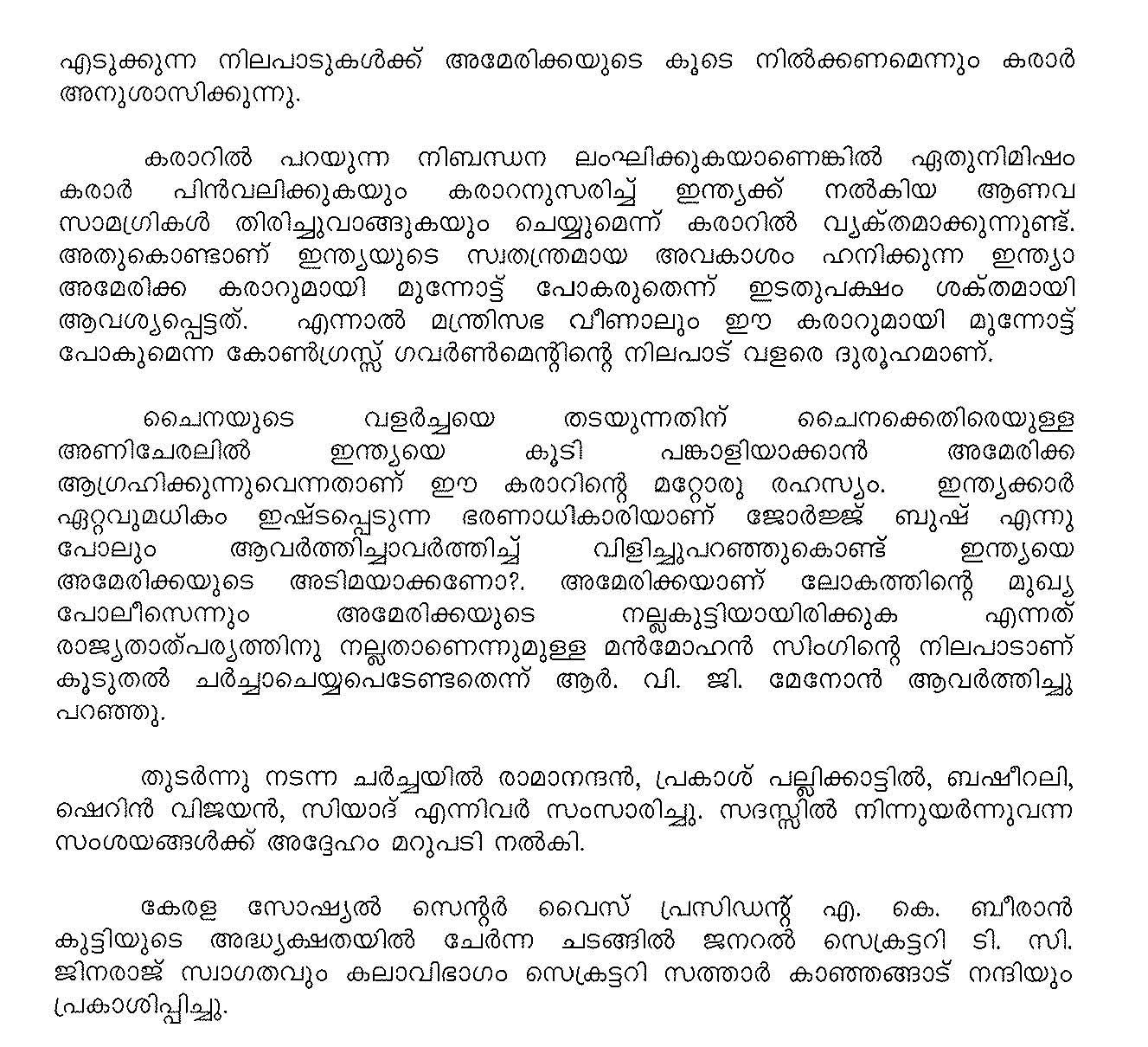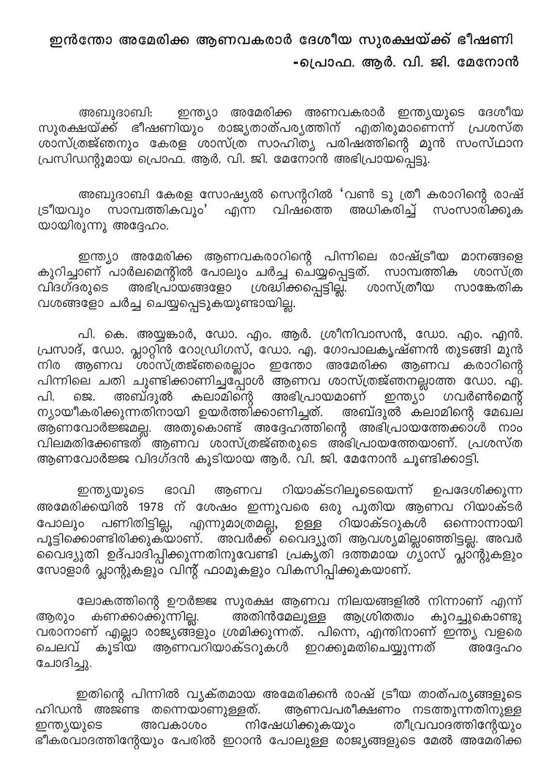 ഇന്ഡോ അമേരിക്കന് ആണവ കരാര് ദേശീയ സുരക്ഷക്ക് ഭീഷണി – Prof. R. V. G. Menon