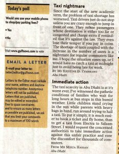 The taxi problems and my pursuit to find a solution for Abu Dhabi road users continues…. If you wish to support me in this, log on to Gulf News (http://www.gulfnews.com/opinion/letters/letters.html) page and express your own comments. Pass it on to any of your colleagues or friends who is experiencing this situation these days while coming and going to office. If we don’t express our problems, no one will realise it.
