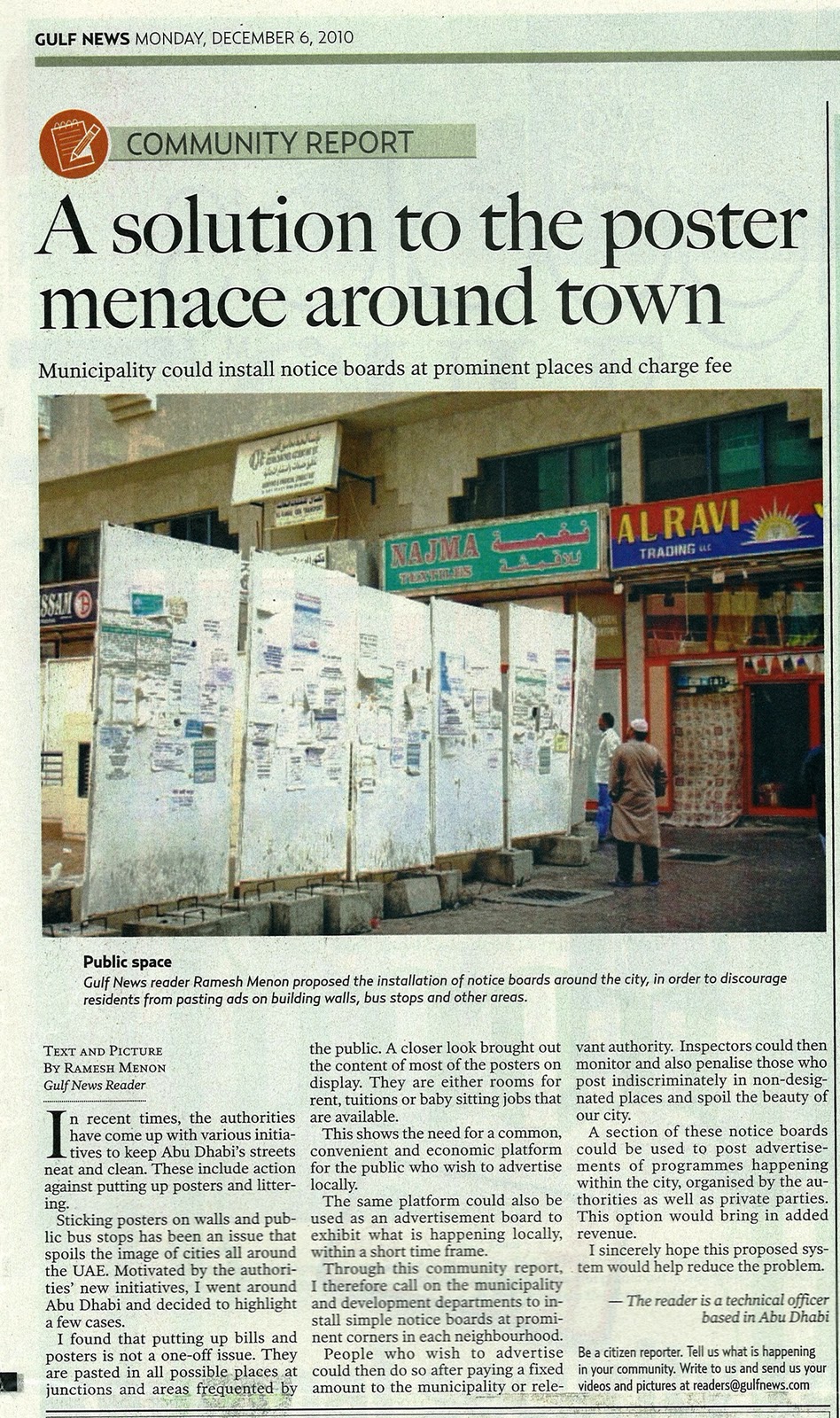 Community Report – GULF NEWS – Dt. 06.12.2010 – A solution to the poster menace around Abu Dhabi
