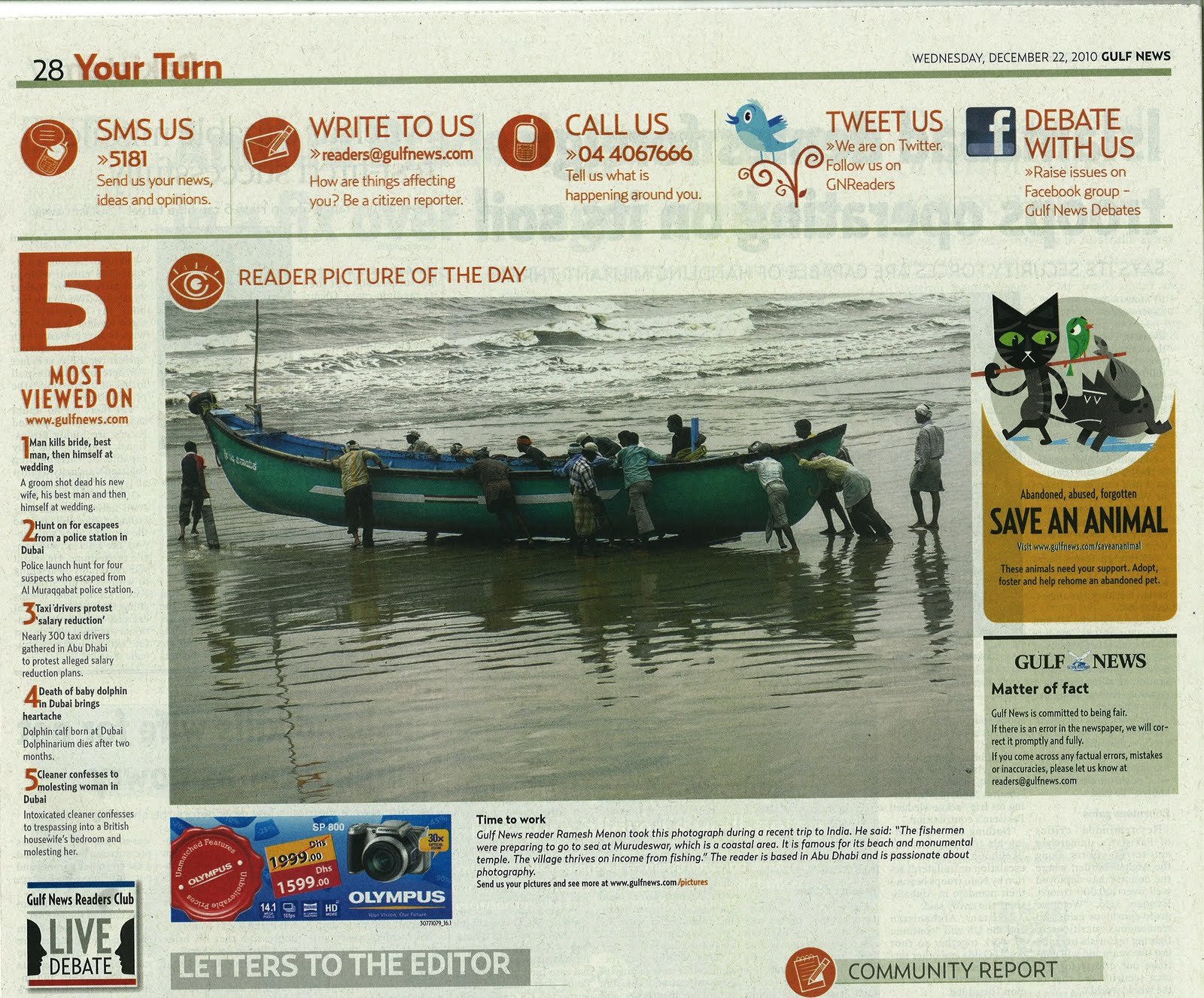 This is a picture I took and submitted to Gulf News recently. It was taken when I was driving from Kerala to Bangalore via Mangalore. This coastal area, Murudeswar, is a beautiful place and were fisherman and at that time I saw the fisherman preparing to go to sea.