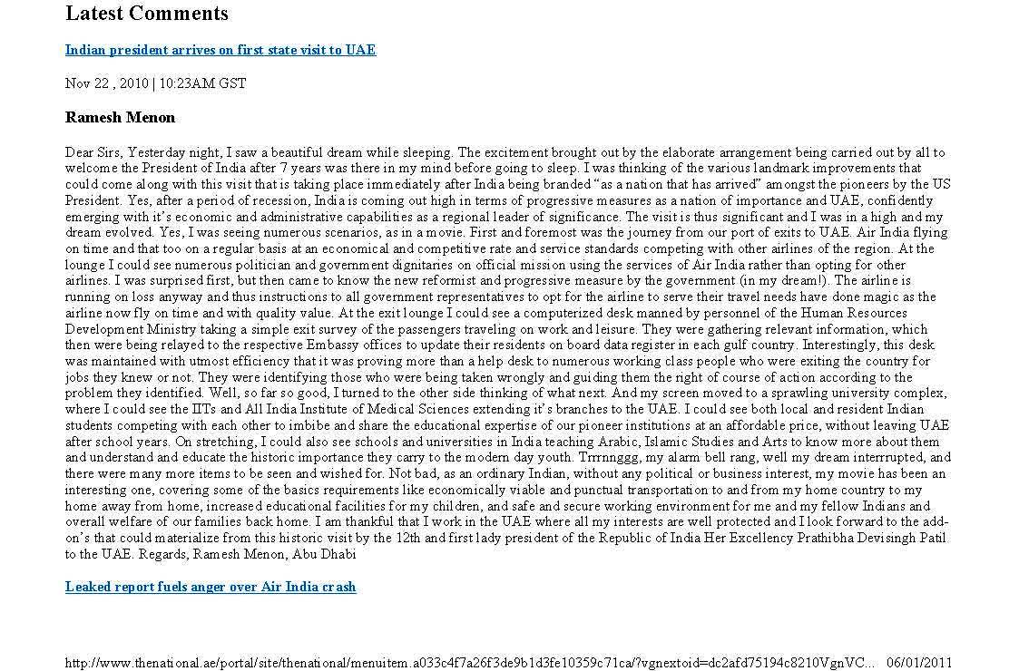 My Comments – THE NATIONAL – Dt 22 Nov 2010 – Indian president arrives on first state visit to UAE