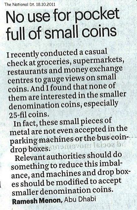 No use for pocket full of small coins – THE NATIONAL Dt. 18.10.2011 – Letters to the editor